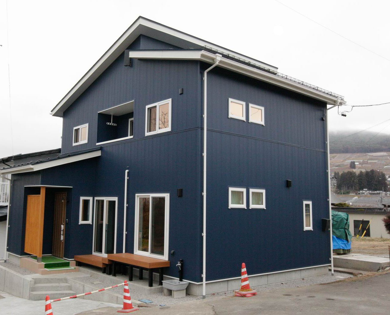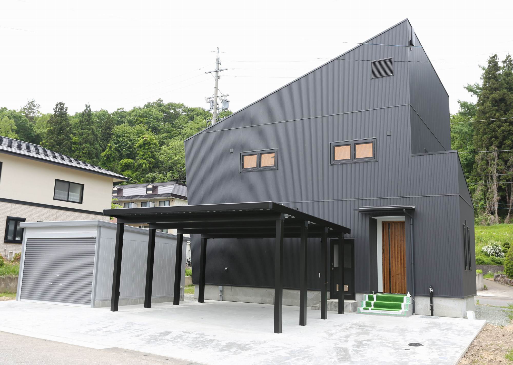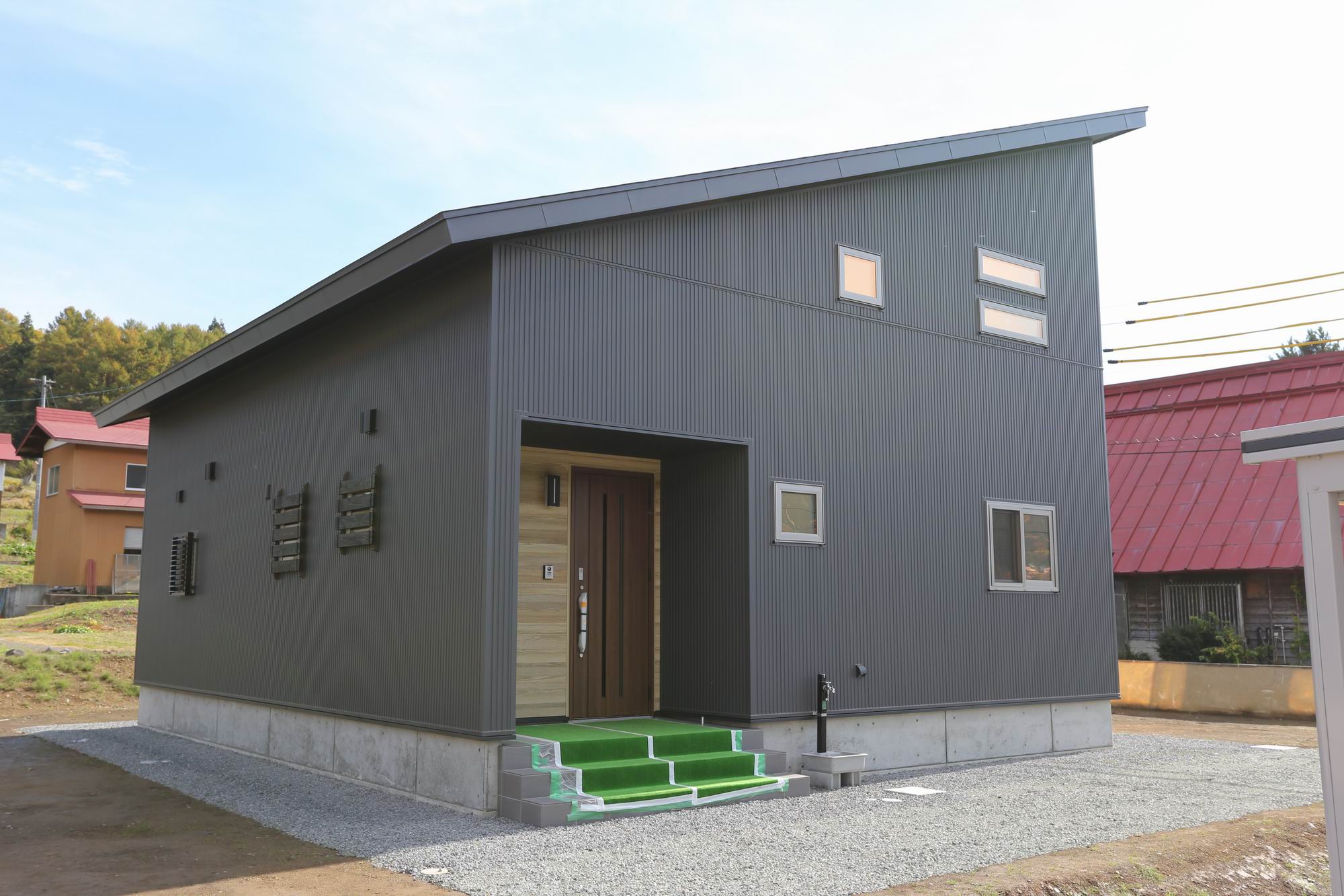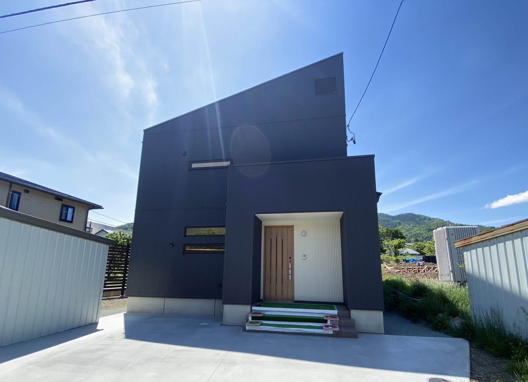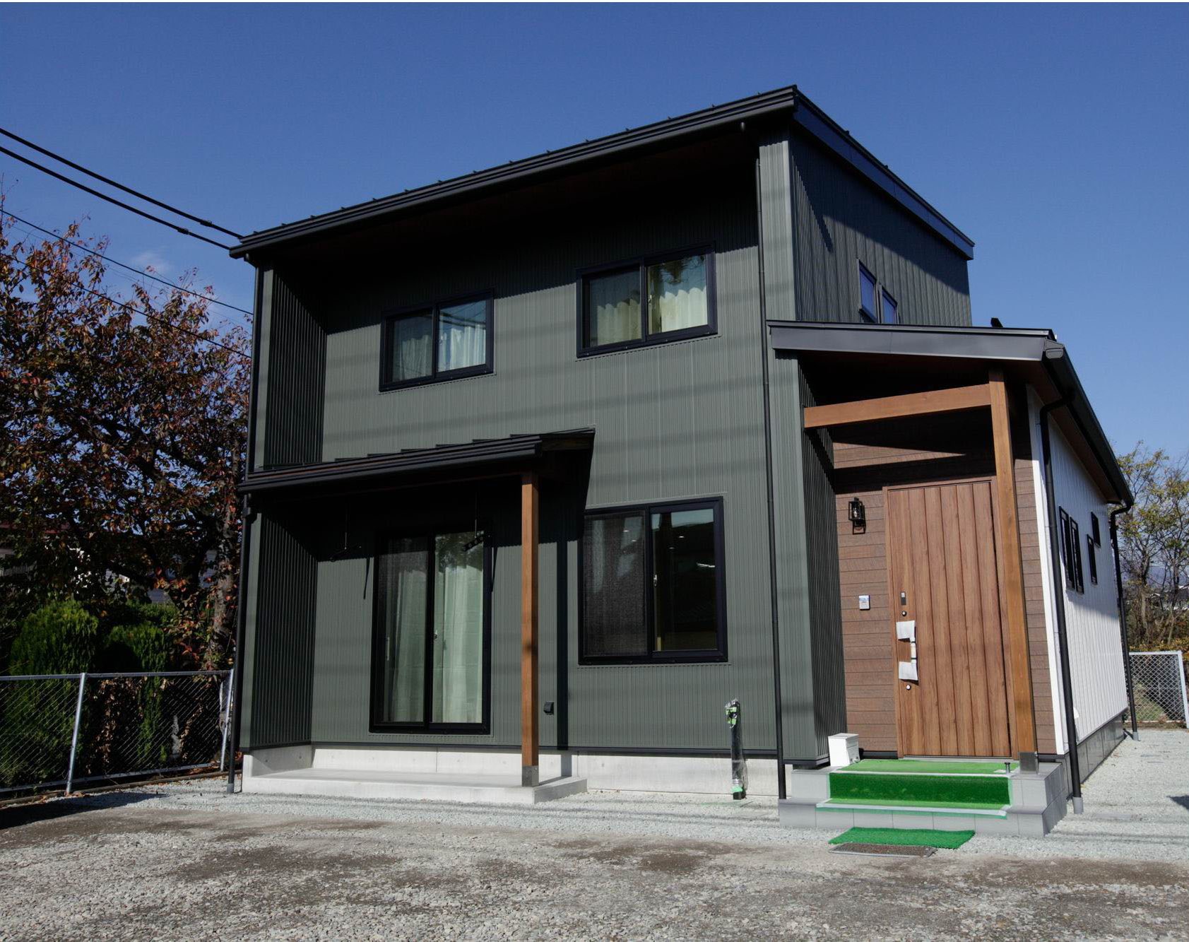 黒ガルバリウムのスタイリッシュモダンハウス 新築 シンプルモダン モダン ウッドデッキ・テラスあり 地震に強い 高気密・高断熱 子育て世代の家 キッチンにこだわり インテリアにこだわり 収納にこだわり 吹き抜けあり 飯山市
