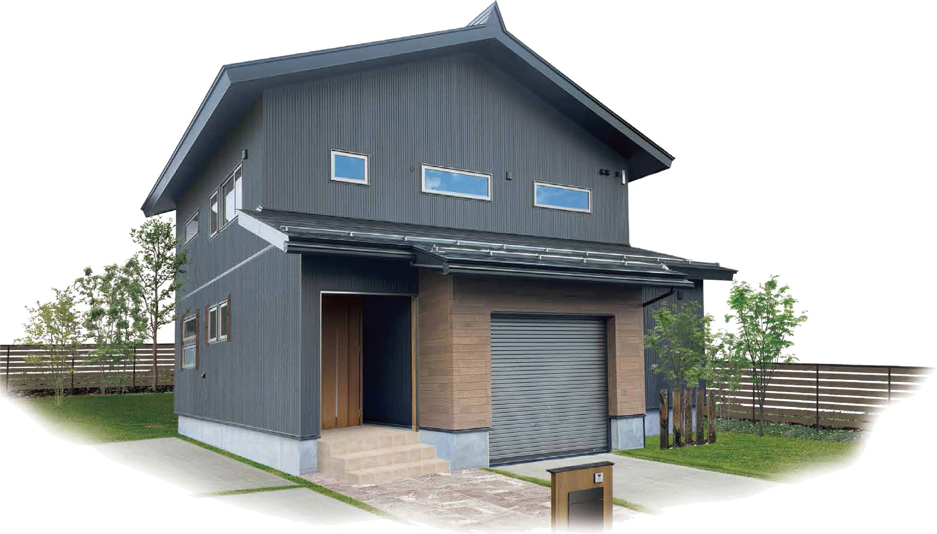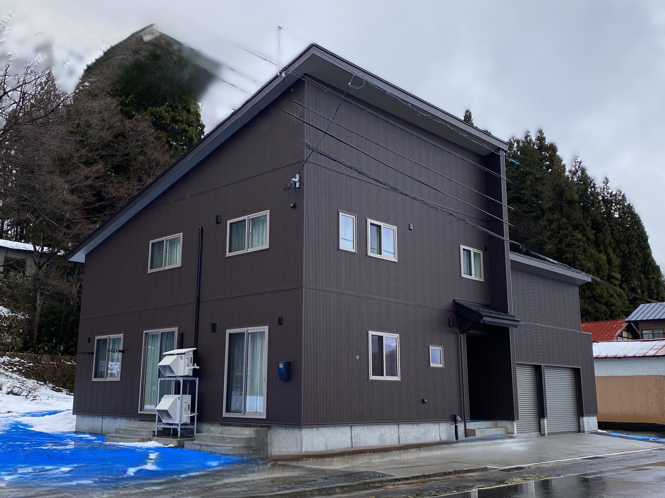 ブラウンの外壁が落ち着きと洗練をもたらす2世帯対応住宅 新築 モダン ガレージあり 地震に強い 暖房にこだわり 省エネ・エコ 高気密・高断熱 2世帯住宅 子育て世代の家 ペットと暮らす家 自然素材の家 キッチンにこだわり 和室あり 飯山市