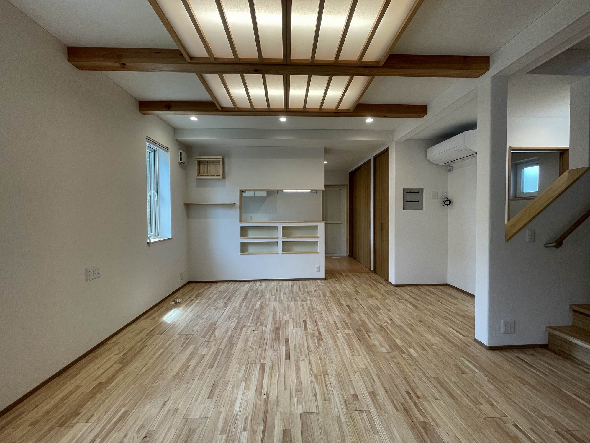 住まいの中心のリビングダイニング。 表し梁とオリジナルの照明が落ち着きを与えている。