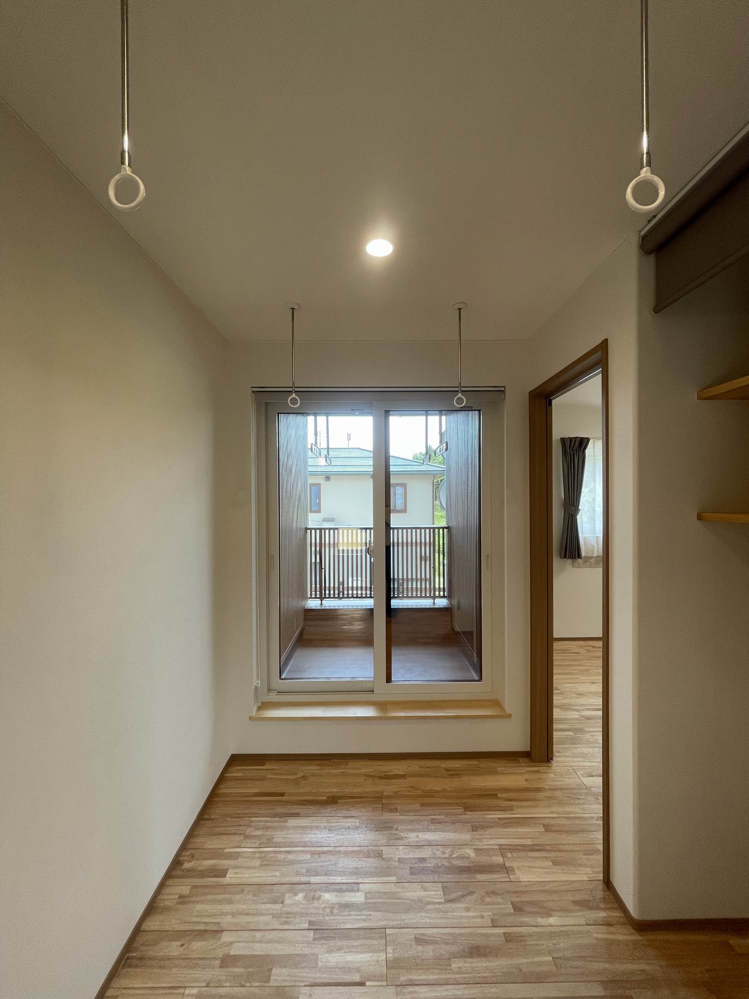 バルコニーにつながる広々ホール。 室内物干しで雨の日も安心。
